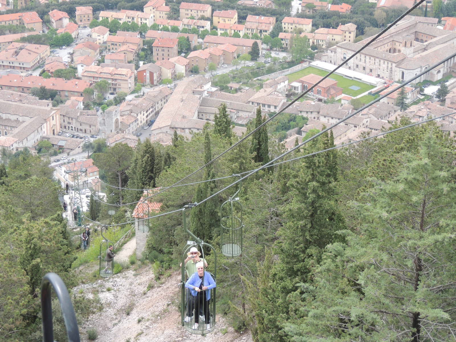 Assisi is Umbria's most well-known hill town, but there are many others. We spent the morning visiting Gubbio, an hour's drive into the mountains. Like Asssi, it's a well-preserved medieval town, with many 14th and 15th century houses scattered up the hillside on either side of steep alleyways. An elevator connects the lower levels of the town to the upper. A funicular takes people two at a time in small cages to the top of a mountain where there's a church, and it's possible to hike to a castle.
